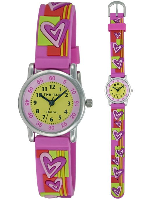 |  нажмите для увеличения | Наручные часы ТИК-ТАК Н101-2 Розовые сердца | Материал корпуса | Alloy | | Размеры корпуса | | | длина | 26 мм. | | ширина | 26 мм. | | толщина | 8 мм. | | Материал ремешка/браслета | PVC | | Длина часов с ремешком | 230 мм. | | Механизм | TMI PC21 | | Особенности | Стрелочная индикация времени | | Комплектация | Картонная коробка ТИК-ТАК, паспорт, инструкция по эксплуатации и гарантийный талон |
